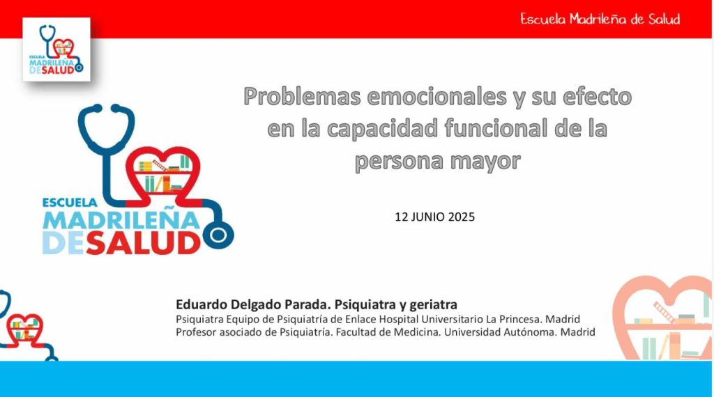 Participación del Dr. Delgado en el aula virtual de la escuela de salud de la Comunidad de Madrid con la presentación «Problemas emocionales y su efecto en la capacidad funcional de la persona mayor«